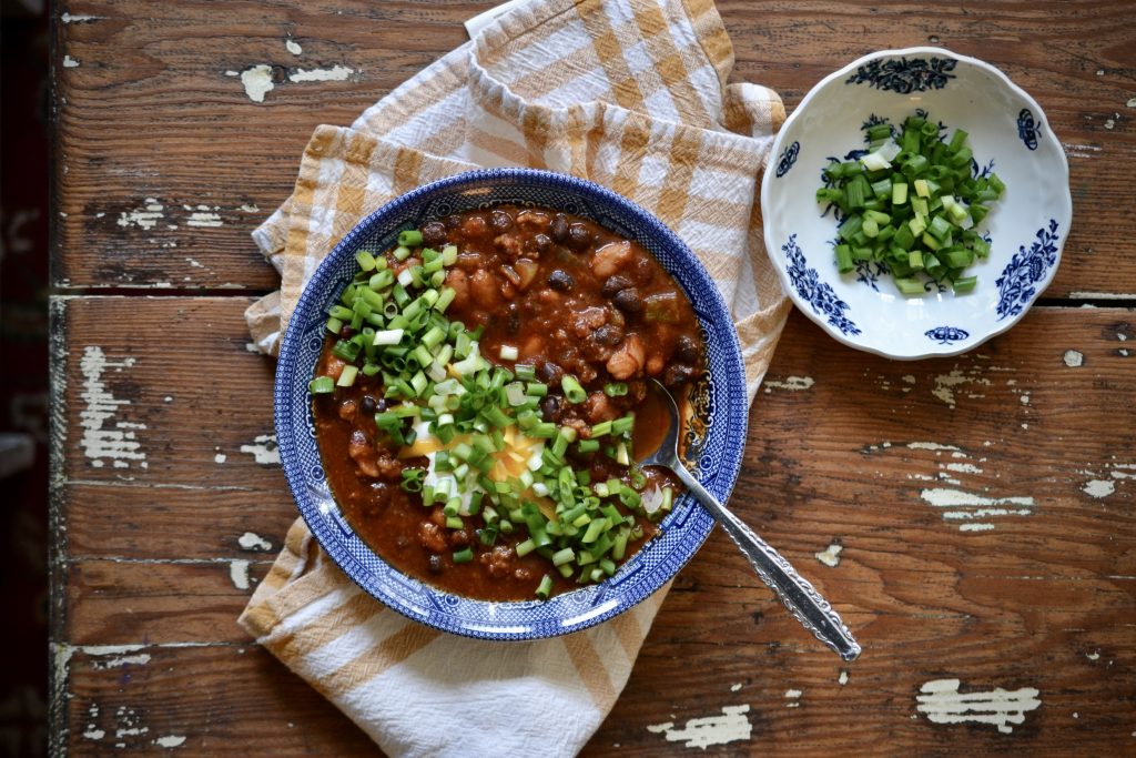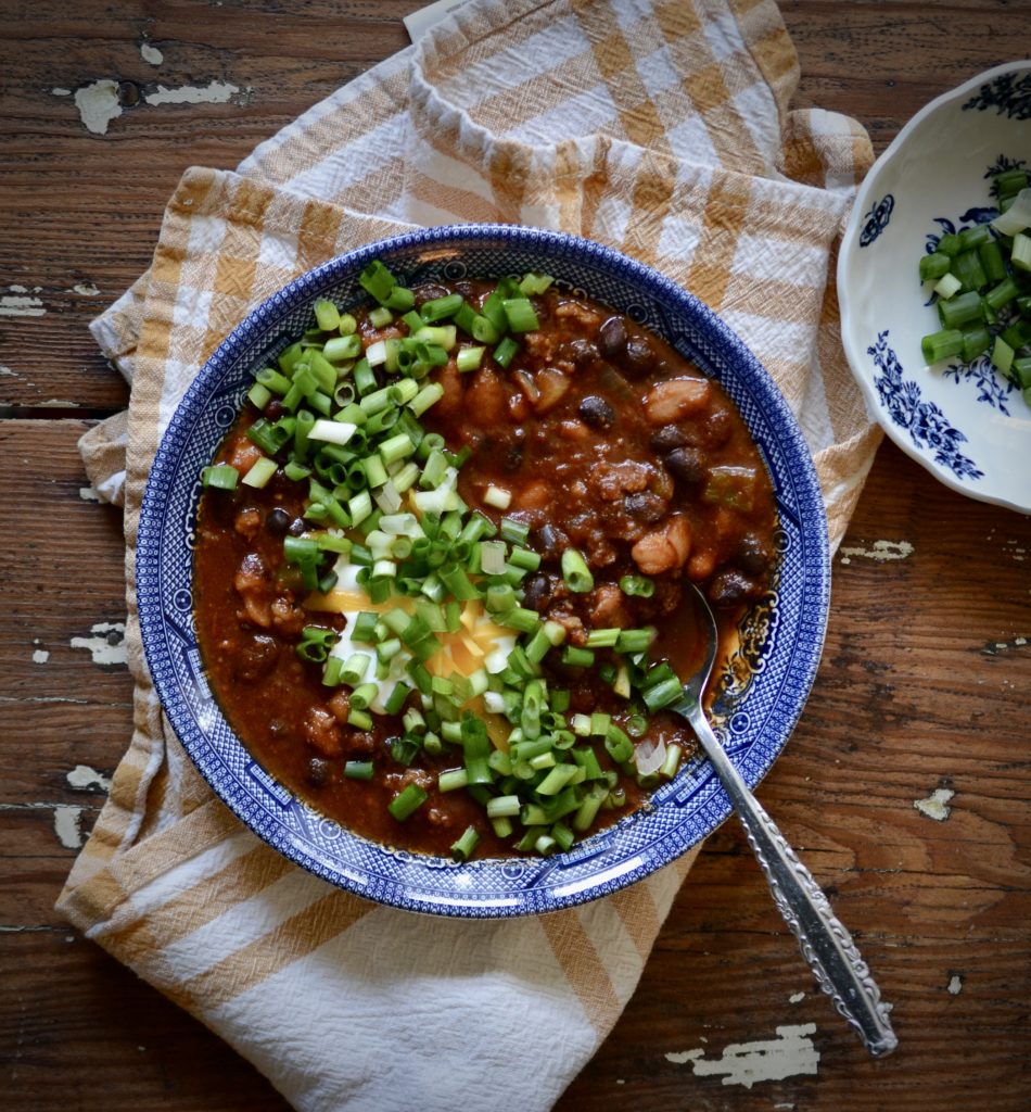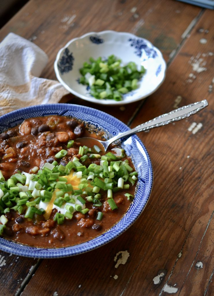 Yes, it happened, I’m a chili lovin’ convert! It’s definitely on the spicy side—loaded with three kinds of beans, hot sausage, and dark beer. I like to top my bowl with sour cream and green onions and serve it with tortilla chips and a cold beer.